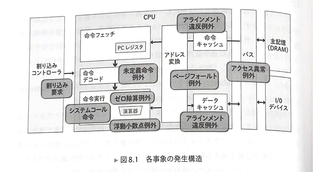 図 8.1 に各事象が CPU のハードウェア構成のどこで発生するかをまとめる.
