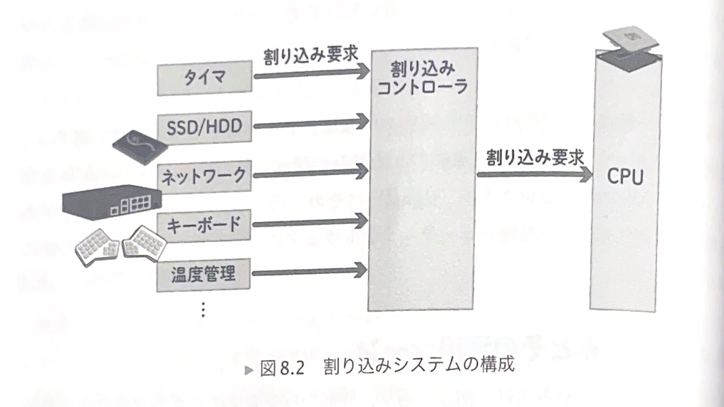 本章における割り込みとは,前述のとおり,外部からの要求における命令流の切り替え事象を指す.システムコール及び例外とは異なり,CPU における命令実行に直接起因する事象ではない.