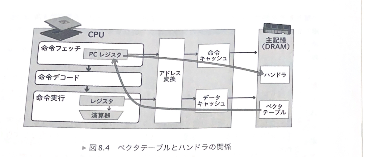 (2)レジスタの値の内容については,必要に応じてハンドラ内のソフトウェアが保存するのが一般的だが,ハードウェアによっては自動的に保存される CPU もある.